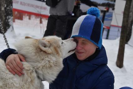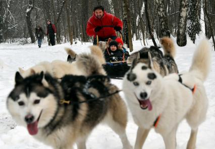Москва. Создатель Хаски-парка в `Сокольниках` Матвей Шпаро катает детей на собачьих упряжках.