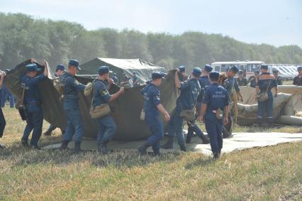 Ознакомление с работой подразделений МЧС России в Южном федеральном округе. На снимке: сотрудники МЧС собирают палатку.