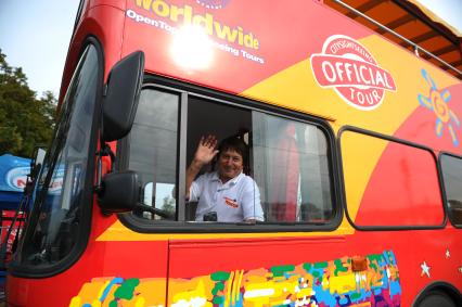 Председатель Комитета по туризму и гостиничному хозяйству Москвы Сергей Шпилько (слева) во время торжественной церемонии открытия экскурсионной линии двухэтажных автобусов.