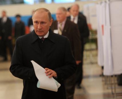 Москва. Президент РФ Владимир Путин во время голосования на выборах депутатов в Московскую городскую Думу на избирательном участке # 2151 в здании Российской академии наук (РАН).