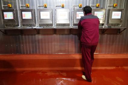 Сотрудник мясокомбината следит за процессом приготовления колбас в печах. Агроферма "Ариант" в Челябинской области