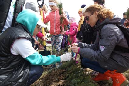 Девочка с саженцем кедра, перед посадкой деревьев, в рамках акции "Лес Победы". Екатеринбург