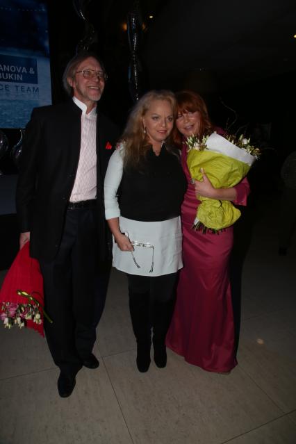 Диск255. Театр РУССКАЯ ПЕСНЯ. Празднование юбилея спортивной и творческой карьеры легендарных фигуристов Натальи Бестемьяновой и Андрея Букина. 2017. На снимке: Андрей Букин, Наталья Бестемьянова и тренер по фигурному катанию Татьяна Тарасова (в центре)