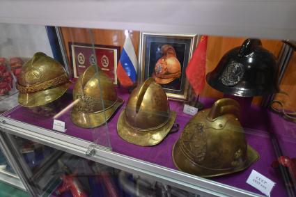 Москва. Парадные каски пожарных разных стран в музее исторического здания пожарного депо XIX века на Пречистенке.