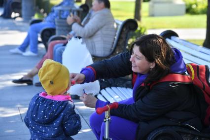 Москва. Люди гуляют на ВДНХ во время празднования Дня города.