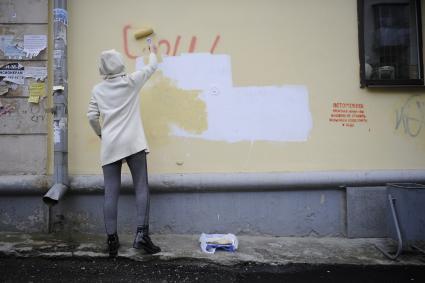 Екатеринбург. Маляр закрвшивает граффити на стене жилого дома