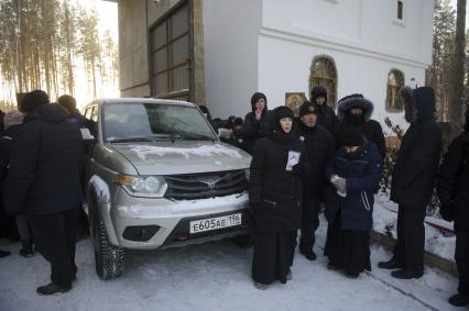 Свердловская область. Среднеуральский женский монастырь. Епархиальная комиссия Екатеринбургской митпрополии и представитель Екатеринбургской епархии РПЦ МП, руководитель епархиального отдела социального служения протоиерей Евгений Попиченко (в центре) у Среднеуральского женского монастыря, где накануне ночью при поддержке ОМОН был задержан бывший схиигумен Сергий, в рамках расследования уголовных дел по статьям Статья 110.1 УК РФ 'Склонение к совершению самоубийства или содействие совершению самоубийств', 148 УК РФ 'Нарушение права на свободу совести и вероисповеданий' и 303 УК РФ 'Фальсификация доказательств и результатов оперативно-розыскной деятельности'.