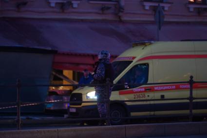 Санкт-Петербург. Машины полиции и скорой помощи у разрушенного кафе на Университетской набережной, где в результате теракта погиб военный корреспондент Владлен Татарский (Максим Фомин).