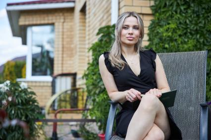 Пермь. Девушка сидит в кресле и читает книгу на приусадебном участке.
