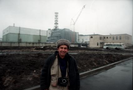 Последствия аварии на Чернобыльской АЭС. На снимке: фотокорреспондент КП Владимир Веленгурин на фоне ЧАЭС.