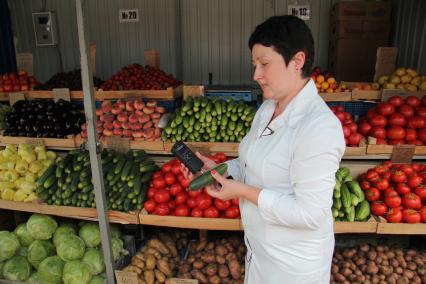 Нижний Новгород. Ветеринарный контроль на продовольственном рынке. Проверка овощей дозиметром.