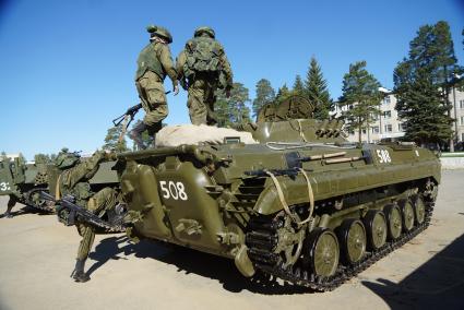Военнослужащие разведывательного батальона мотострелковой бригады, во время смотра вооружения и обмундирования коммандным составом ЦВО. 32-й военный городок. Екатеринбург