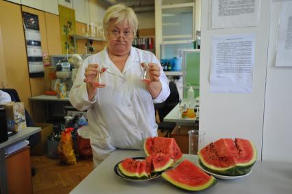 Москва. Проверка арбузов на наличие нитратов в испытательной лаборатории `Эксимтест`.