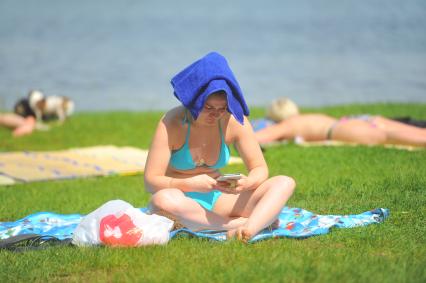 Девушка блондинка на пляже разговаривает по мобильному телефону В Выходные на пляже в Серебряном бору, Москва, 3 июля 2011 года