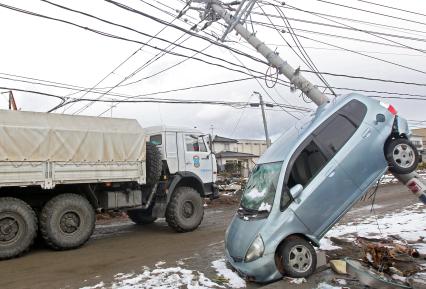 В Японии, после разрушительного землетрясения и цунами. Общие виды на разрушения. Разбитый грузовой автомобиль.