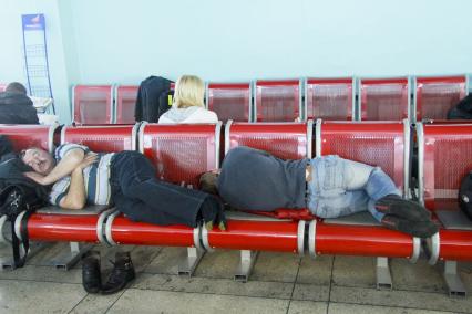 Спящие гости столицы в зале ожидания аэропорта `Домодедово`.