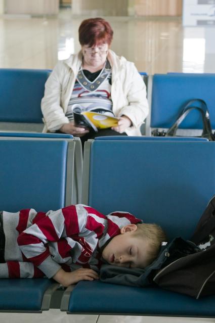 В ожидании рейса ребенок спит на кресле в аэропорту, женщина читает журнал.