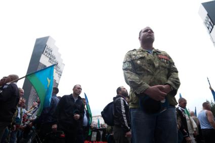 ветераны ВДВ держатся за руки во время празднования дня ВДВ в Екатеринбурге