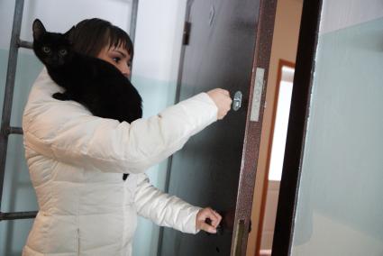 Свердловская область, г. Серов. Девушка запускает кошку в свою квартиру в новом доме, полученную по программе `Доступное жилье` для молодых семей.