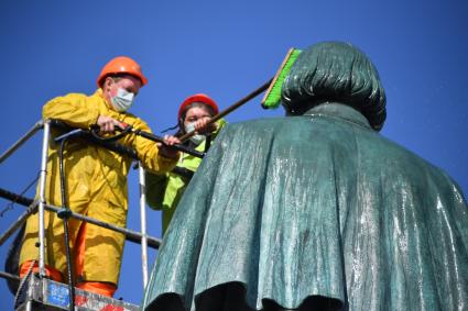 Москва. Работники коммунальных служб моют памятник Н. В. Гоголю на Гоголевском бульваре.