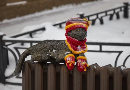 Пермь. Скульптура кошки, одетая в вязанную шапку и шарф.