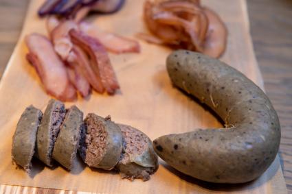 Москва. Колбаса, сделанная из мяса диких животных на Фермерской ярмарке в Сокольниках.