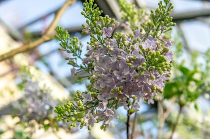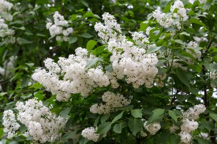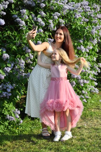 Москва. Девушка с девочкой делают селфи на фоне цветущей сирени.