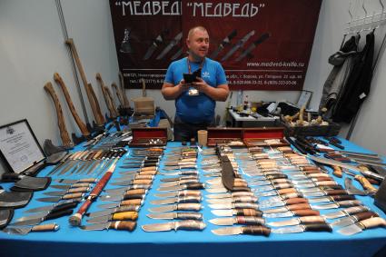 Нижний Тагил. Посетители изучают ножи у стенда `Златоустовской оружейной компании` на 10-ой международной выставке вооружений `Russia Arms Expo - 2015`.