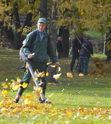 Работники коммунальных служб сгребают листья в кучи на газоне