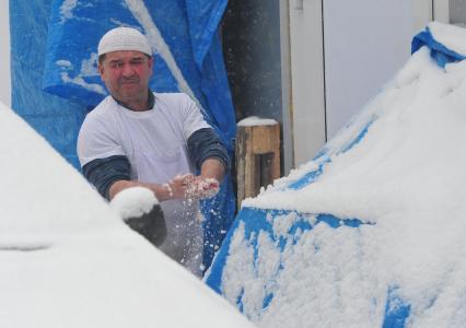 Екатеринбург. Гастарбайтер убирает снег лопатой во время снегопада.