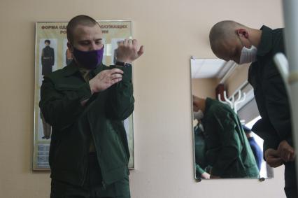 Свердловская область. Окружной сборный пункт (ОСП). Во время призывной кампании, для нераспространения новой коронавирусной инфекции COVID-19 на территории ОСП введен особый противоэпидемический режим. На фото: призывники переодеваются в военную форму