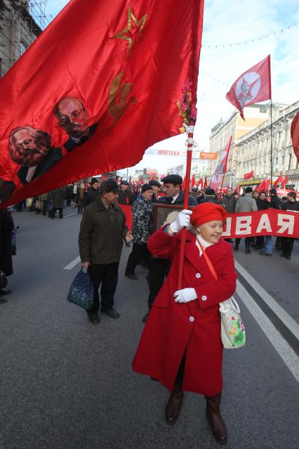 Дата съемки : 07.11.2010 Шествие КПРФ в честь годовщины Октябрьской революции в Москве На фото : Представительница КПРФ с флагом принимает участие в шествии по Тверской улице, посвященном 93-й годовщине Октябрьской социалистической революции